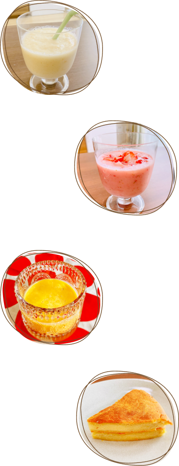 梨のラッシー 苺スムージー かぼちゃプリン さつまいもケーキ